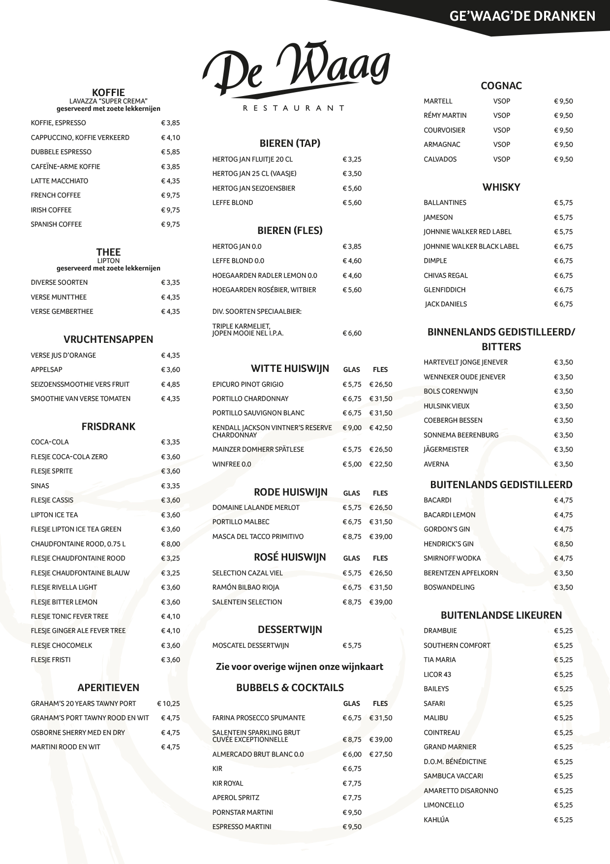 Hieronder vindt u onze drankkaart, deze dranken gelden voor bij een diner maar ook als u gezellig met vrienden alleen wat komt drinken aan onze bar.